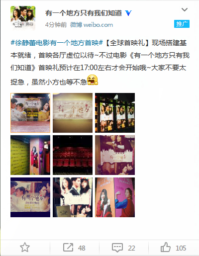 【全球首映礼】现场搭建基本就绪,首映各厅虚位以待~不过电影《有一个地方只有我们知道》首映礼预计在17:00左右才会开始哦~大家不要太捉急,虽然小方也等不急[抓狂]