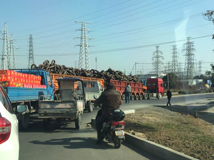 轮船的一个『手刹』就得用这么大的卡车去拉,可见船的运载量有多大。