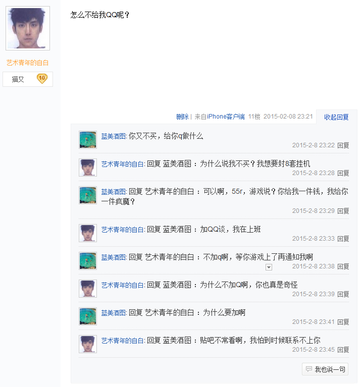 我都没问你要支付宝,自己马脚都露出来了 不就是准备好别个QQ号和支付宝嘛 真是逗B 那天跟我小号QQ聊的可爽