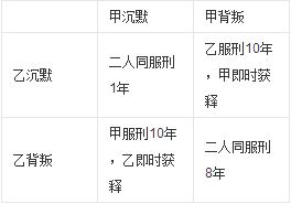 若一人认罪并作证检控对方(相关术语称“背叛”对方),而对方保持沉默,此人将即时获释,沉默者将判监10年。