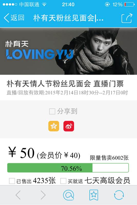 朴有天20150214成都见面会乐视网路直播 ,去不了成都的亲们请赶紧抢票啦!请以这张方式告诉他我们爱着他!