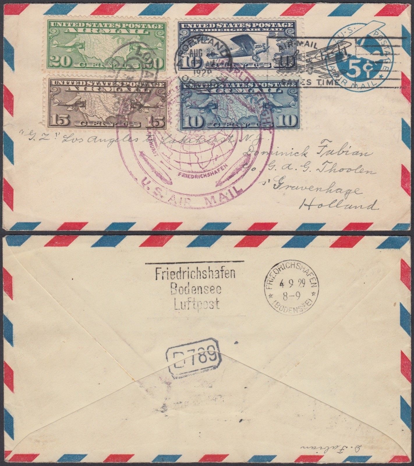再发张1929年齐柏林伯爵号飞艇环游世界搭载封,美国飞德国转荷兰航段,不知是否算“飞机题材的邮政用品”??
