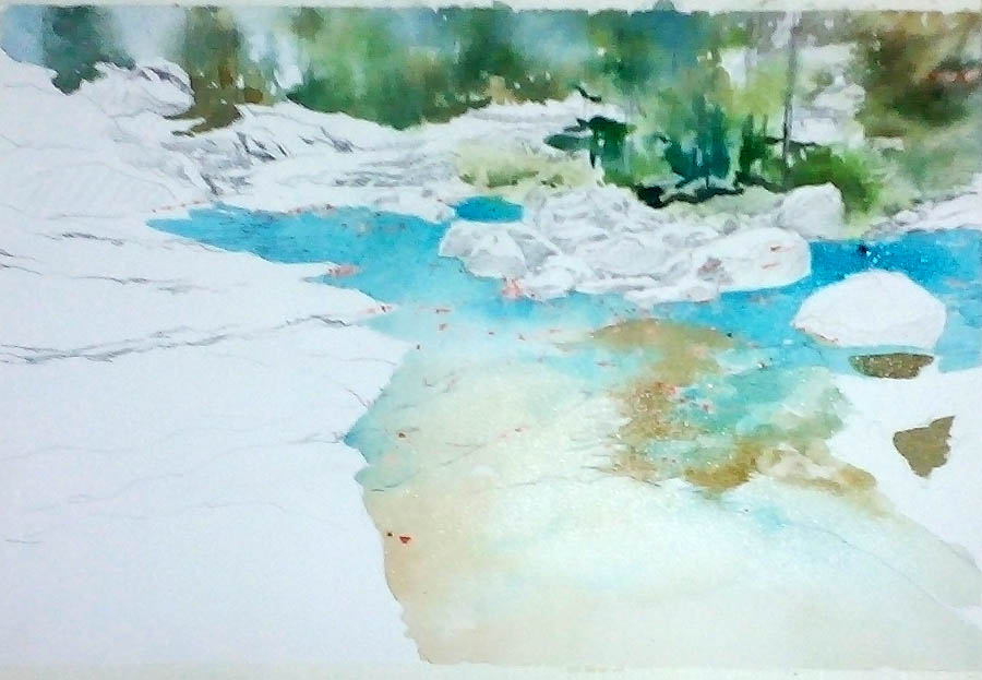用钴蓝画水面第一遍色。