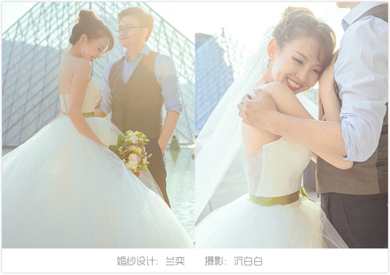 去年的春天,他们来到成都,为婚纱定款、试版。记得她的欢快笑容与真挚期待,还有他对她的温暖与呵护。她喜欢的绿色腰带也终于飘扬在了卢浮宫广场上。在追求所爱的道路上,我们一样执着。尽最大的努力去做好每一处细节,抬头就会看见更美丽的风景。婚纱设计:兰奕,摄影:沉白白。