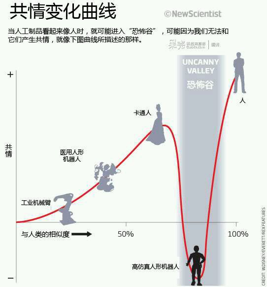 恐怖谷理论:人们对低程度拟人的非人类物体很喜爱,但当这个拟人程度达到很高的高度却又不能做到百分百