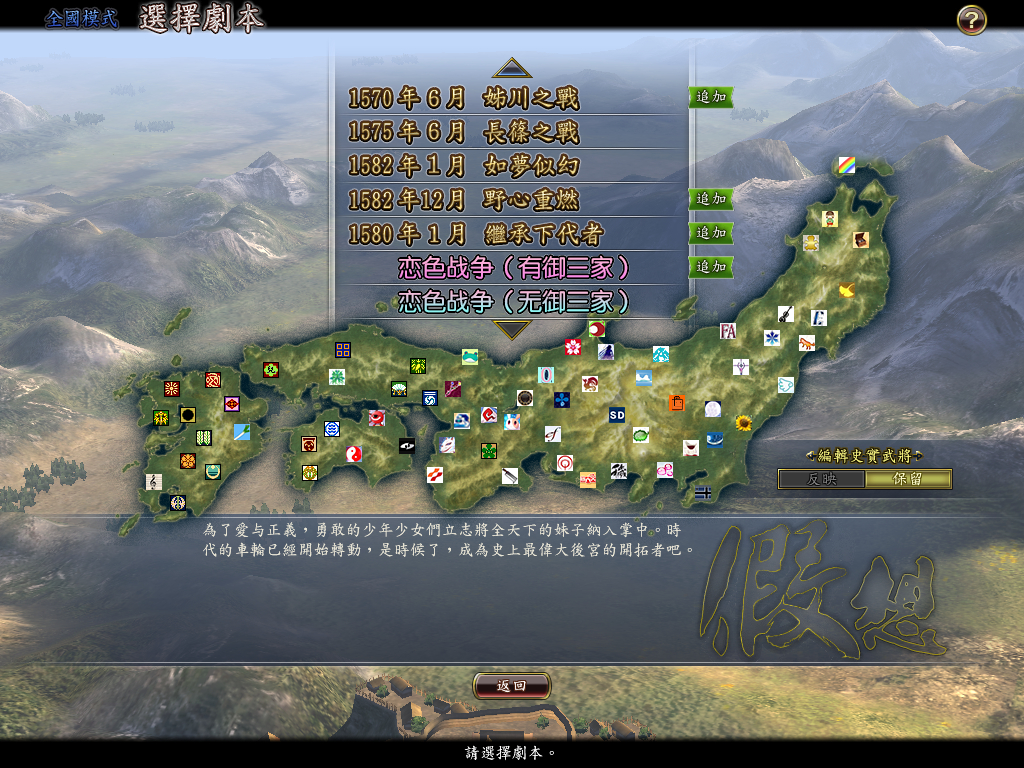 这次由我在这里向大家发布我们工作室这一次的作品,这次我们制作的是一个信长之野望13天道PK版的萌化MOD。