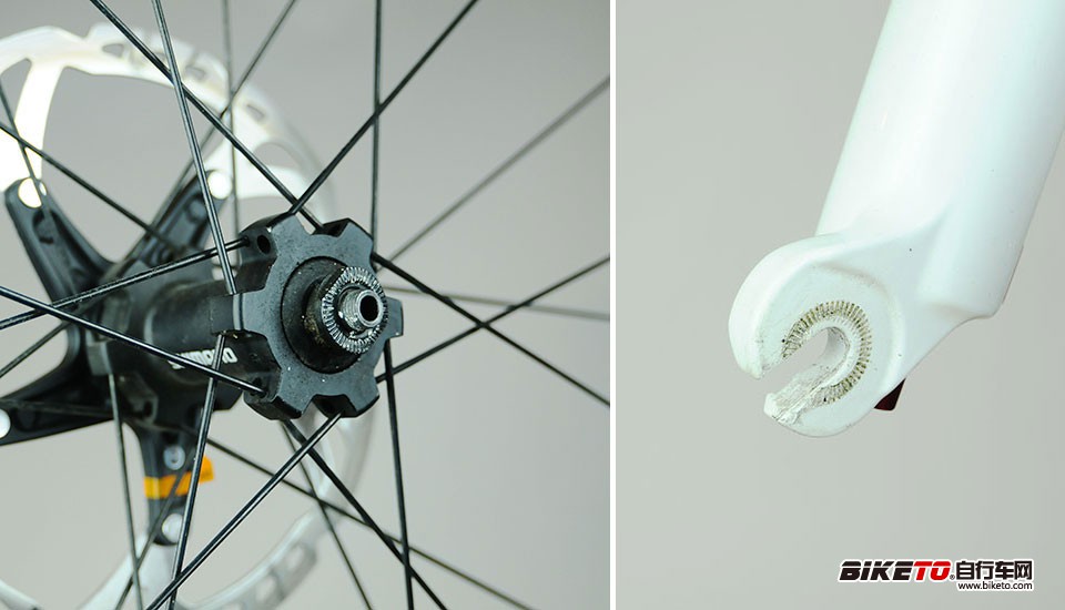 我们现在避震前叉常用的9mm开放式抓勾设计,XC竞赛级别为了方便拆卸而沿用至今,操作也十分简单。但相比现在流行的桶轴设计,开放式抓勾的强度要逊色许多,桶轴设计的前叉还没有遇到过因为前轮拆装导致的蹭碟问题,而9mm开放式抓勾就遇到这种问题,蹭碟的几率有70%之多。