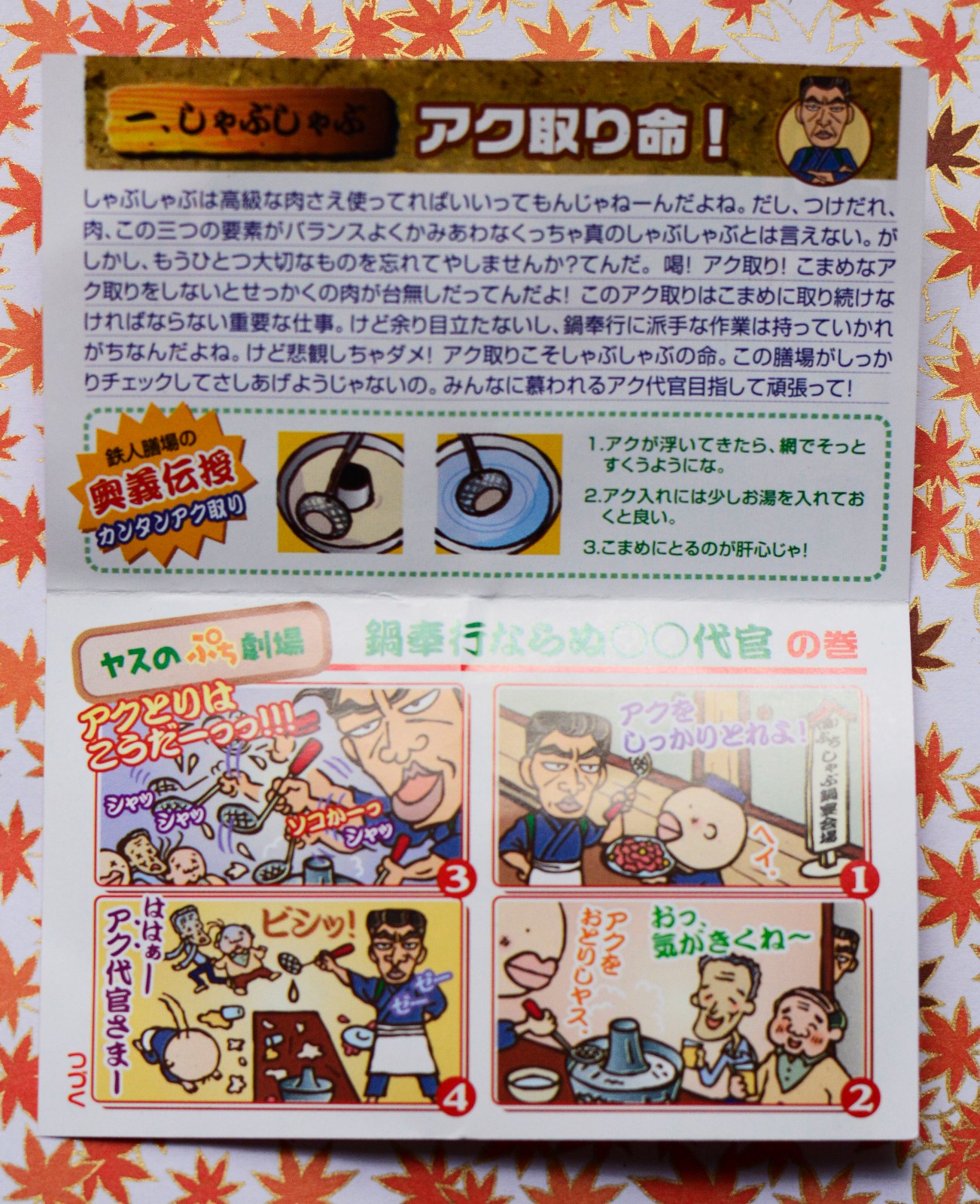 图片来自:傻兔52的百度相册早期的蛋纸都有吉祥物的小漫画.还蛮有趣的~~哈哈哈~~~看来日本火锅和我们这边也一样都要把汤上的杂质去除.漫画太形象了~~~