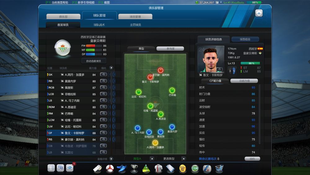 偶尔用8级10弗兰打前锋,基本用原本贝蒂斯球员