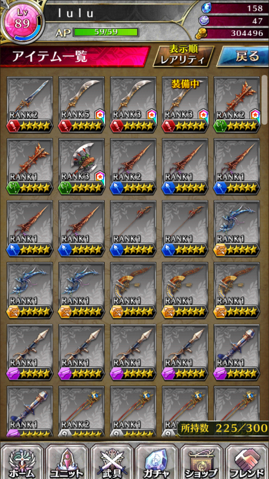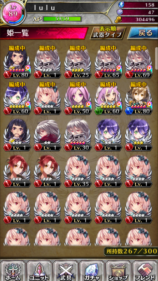 文字介绍: 89级帐号 成熟80级主力2个 其它半成品主力3个 可进化5星的 86个 转生莉莉丝 3个 角色仓库 道具仓库都开到300 姬石158个 友情币234450 5星武器38个 4星武器81个 详细后面会放图 另外名字可以改 不用在意