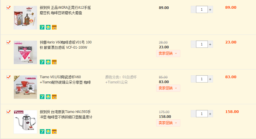 仿作弊手冲壶=99刀;Hario V60 彩色树脂滤杯=25 配套滤纸=23;磨豆机正晃行A12=89~~~ 等匿名2代出来了再考虑入一个
