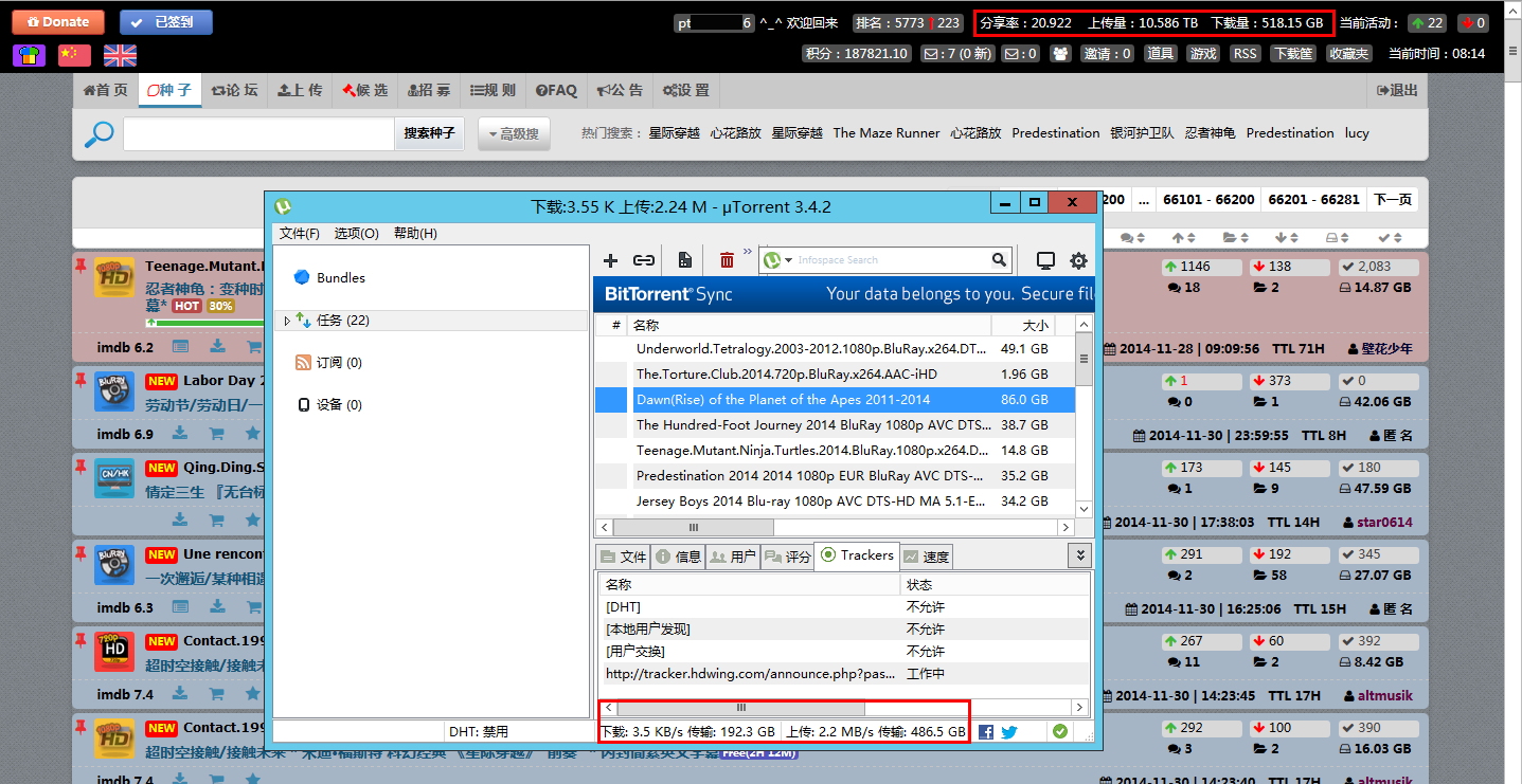 本人比较忠诚,去年在朋友推荐下注册了一个HDWing就一直用到现在,最近HDWing进不去了,现在想求一个CHD的邀请,本人20M对称光纤,马上升100M了,HDWing的截图不多,只有去年的12月份有一张,大概情况就是单位有一台专用于PT下载的机子,6T磁盘阵列空间,24*7不间断上传,截止到HDWing登陆不上的时候已经差不多15T上传量,如果你有多余的邀请,请给我一个吧,绝对不让你浪费,万分感谢!!