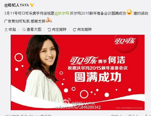 其实可以理解成,可口可乐花钱请何洁去给奥尔玛超市拜年,,,