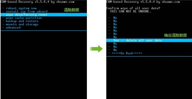 - wipe data/factory reset 清除数据 - yes -- delete all user data 确定清除