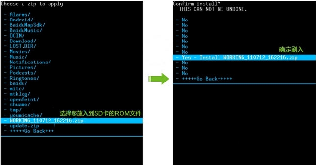 - 选择您所放入内存卡的ROM文件 - Yes - Install 确定刷入