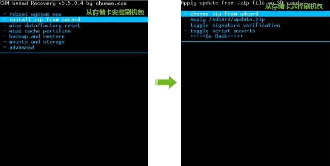 - install zip from sdcard 从存储卡安装刷机包 - choose zip from sdcard 从存储卡选择刷机包