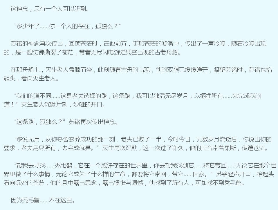 这个时候苏铭已经说秃毛鹤没有找到,原文是:帮我去寻找……秃毛鹤,它在一个或许存在的世界里,你去帮我找到它……将它带回……无论它在那个世界里做了什么事情,无论它成为了什么样的生命,都要将它带回,带它……回家。