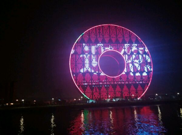 广州圆大厦位于广东省广州市荔湾区白鹅潭经济圈最南端,是由意大利人约瑟夫设计的一座半圆形建筑物,呈“U”字形状。大楼将建成138米高、外圆直径146.6米、内圆直径47米的33层建筑。“大楼形状像‘水轮车’,且与珠江水里的倒影形成‘8’字,寓意塑料交易风生水起。由于此建筑形似铜钱,网友称其为“铜钱大楼”。