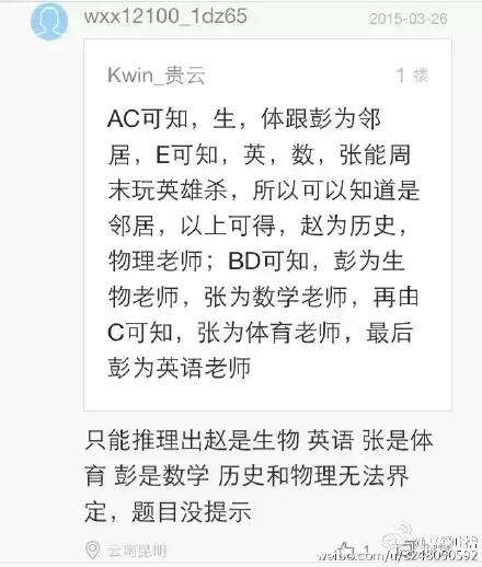 回复 gaojingtuan :楼主有标准答案吗?物理和生物怎么判断?几位的年龄是可以排出来,但是年龄怎么作为教哪门课的依据?