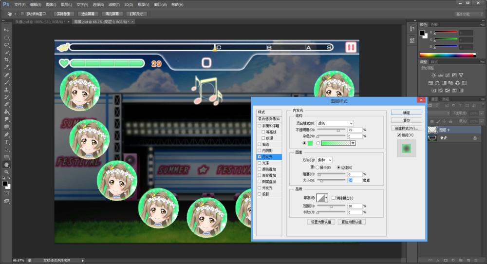 右键头像图层,混合选项,选择合适的内发光以及外发光(没有外发光的话边框会显得较粗糙),适当调整。
