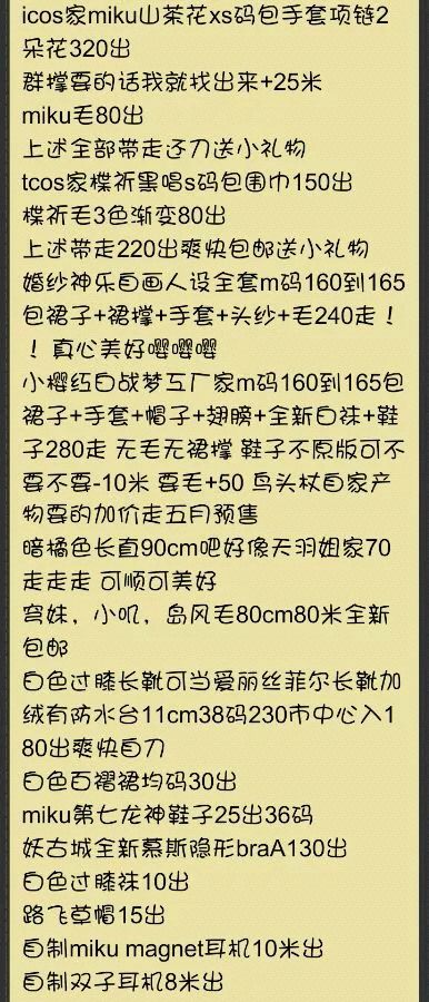 : ☆cos全套白菜受已自刀★ 1.黑子的篮球/相田丽子教练服/毛+衣服=180r 2.蔷薇少女/雏莓/毛+衣服+鞋=230r 3.蔷薇少女/翠星石/衣服=200r 4.v家/镜音铃公式全套/毛+衣服+鞋=200r 5.LL/南小鸟未觉醒旗袍/衣服=230r 以上可?