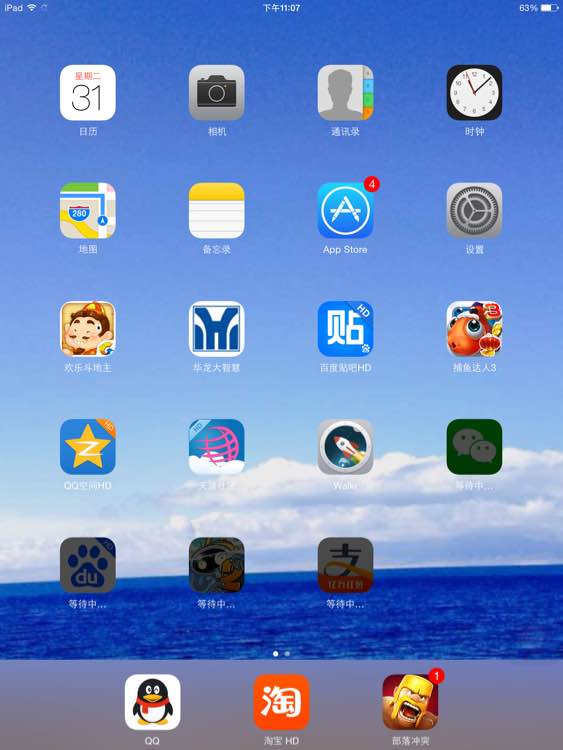 然后主屏幕,更新的软件全部黑乎乎,如果不管它,可以一直黑乎乎下去。如图