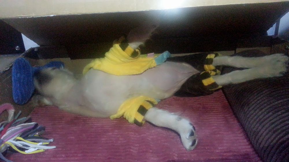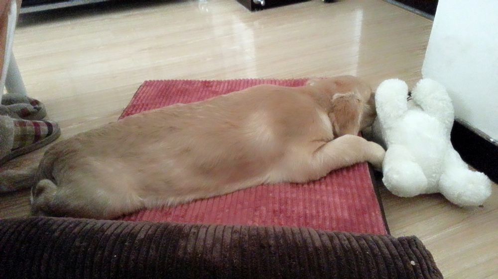 英镑来我家第一个晚上,好小好小一只,毛毛几乎就是白色的,抱在手里软乎乎的,但是表情非常严肃,不伸舌头,也不笑,喝了点水就趴一边儿睡觉,我觉得它可能有点不高兴