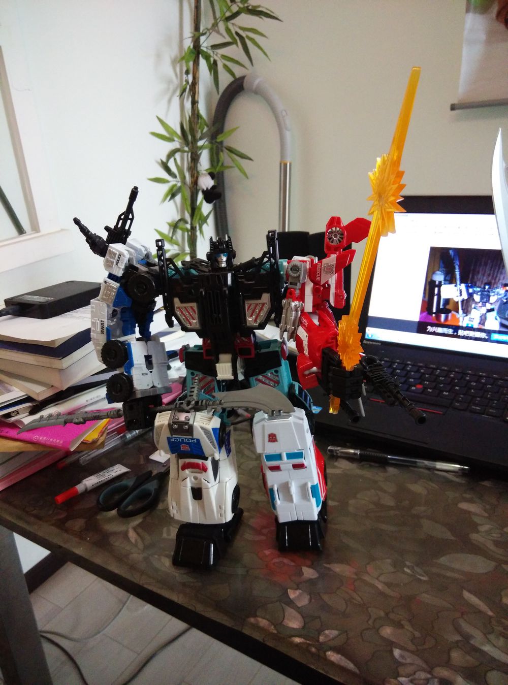 把热点的红色胸甲拆来做合体后的腰部,借用了国产星猫的手和脚,借用了百兽王的光芒神剑和国产修罗王的武器,全副武装上阵搏杀。