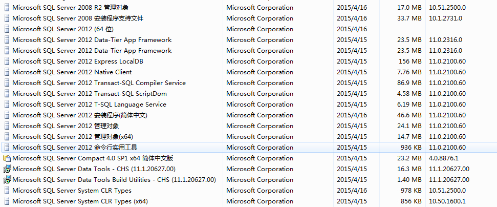 我本本没有一个数据库服务器,由于要做软件,就开始安装了vs2012,好在它自带sqlserver,安装好后,程序与卸载里有一大堆sqlserver的程序,如: