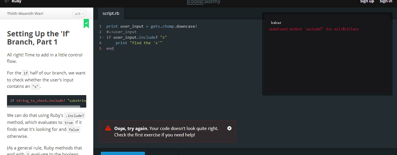 一般来说method后面跟一个叹号!表示这个方法将会对对象自身做修改,这样的方法一般也是没有返回值的。String#downcase方法实际是根据当前字符串重新构造一个新小写字符串并返回,而String#downcase!是直接把当前字符串转为小写,返回nil。第一张图中,将末尾!去掉即可。