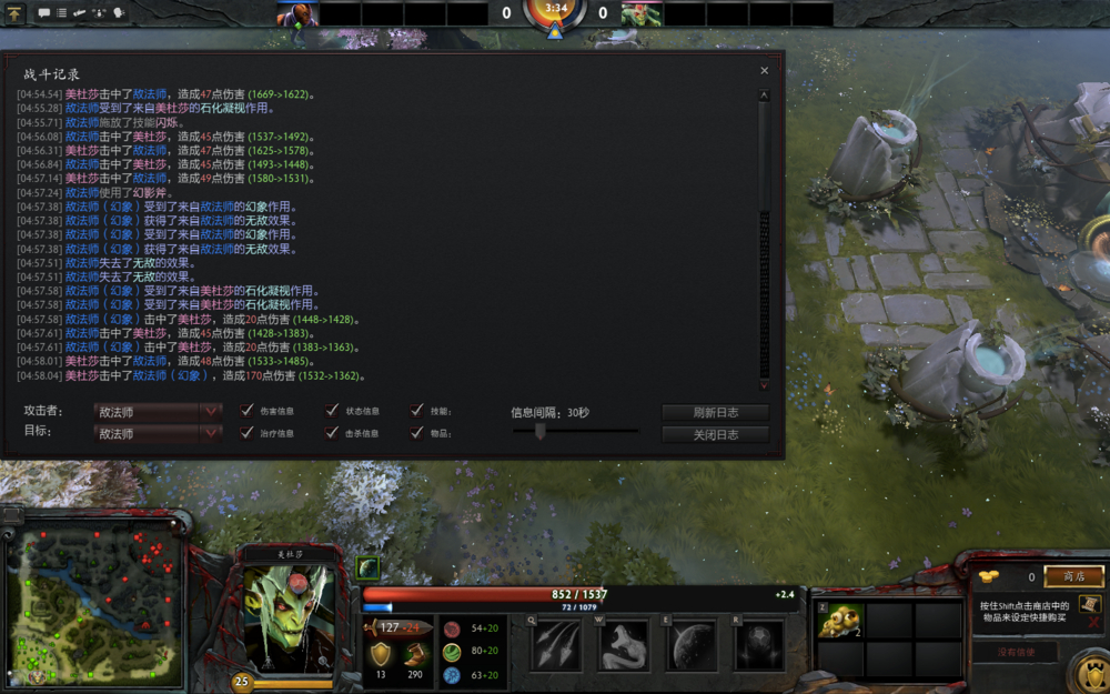 通过战斗日志可以清楚地看出,使用分身的无敌时间可以在美杜莎大招石化结算时躲掉石化效果,实际也不会再被石化。美杜莎的大招在状态栏下会有一个大招buff,在转到四分之一到三分之一的时候使用分身斧即可。分身斧是无敌时间最短的,换做其他各种无敌时间更长的分身技能或无敌技能躲避起来更加容易。