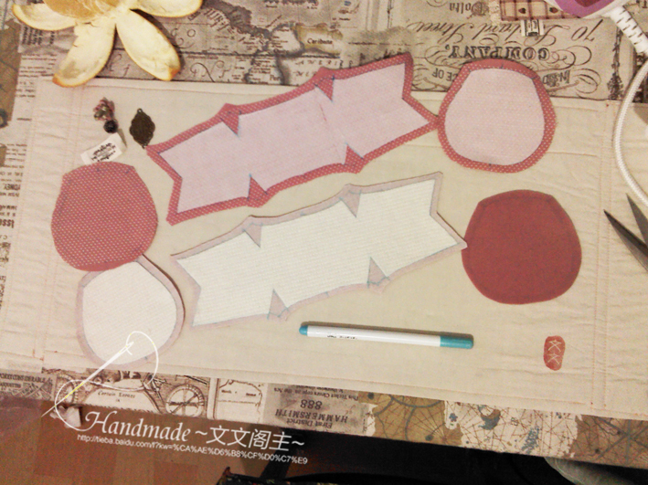 裁好表布、里布、铺棉和衬。要在裁好的布片上画出中心点和关键点(见图纸)烫铺棉、布衬。偶选的里布有点软所以也加了衬。有挺度的布料可以不加