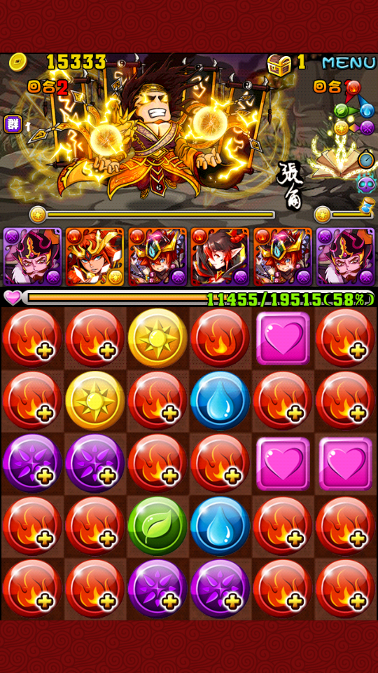 BOSS关 因为有很多奇怪的buff不多说了详情看上面那个链接 消暗珠啪啪啪天书(别问我为什么我也不知道)然后SL大炮轰张角 张角每2回合复活一次天书 然后天书打你1W8外加毒若干 所以请两回合回2W血 每次天书复活就消暗珠啪啪啪它(都说别问我为什么) 然后再SL大炮轰张角 累计轰个三十几炮应该就好了 三十几炮 因为很重要所以多说几遍 是三十几炮