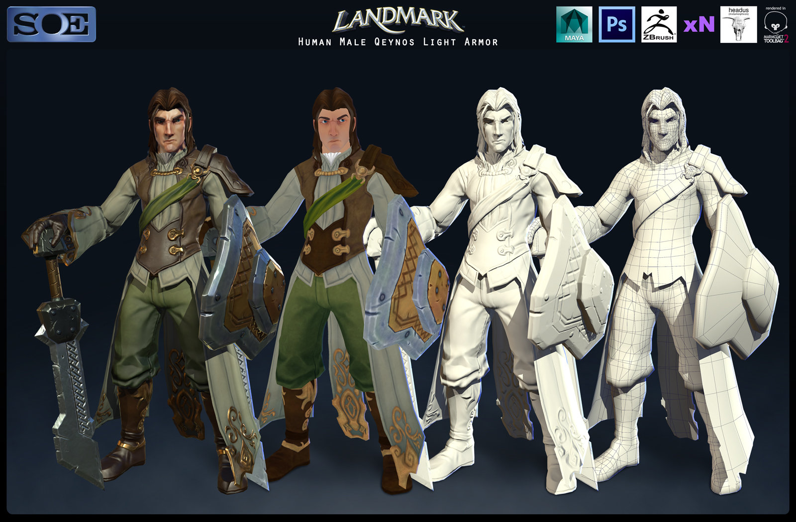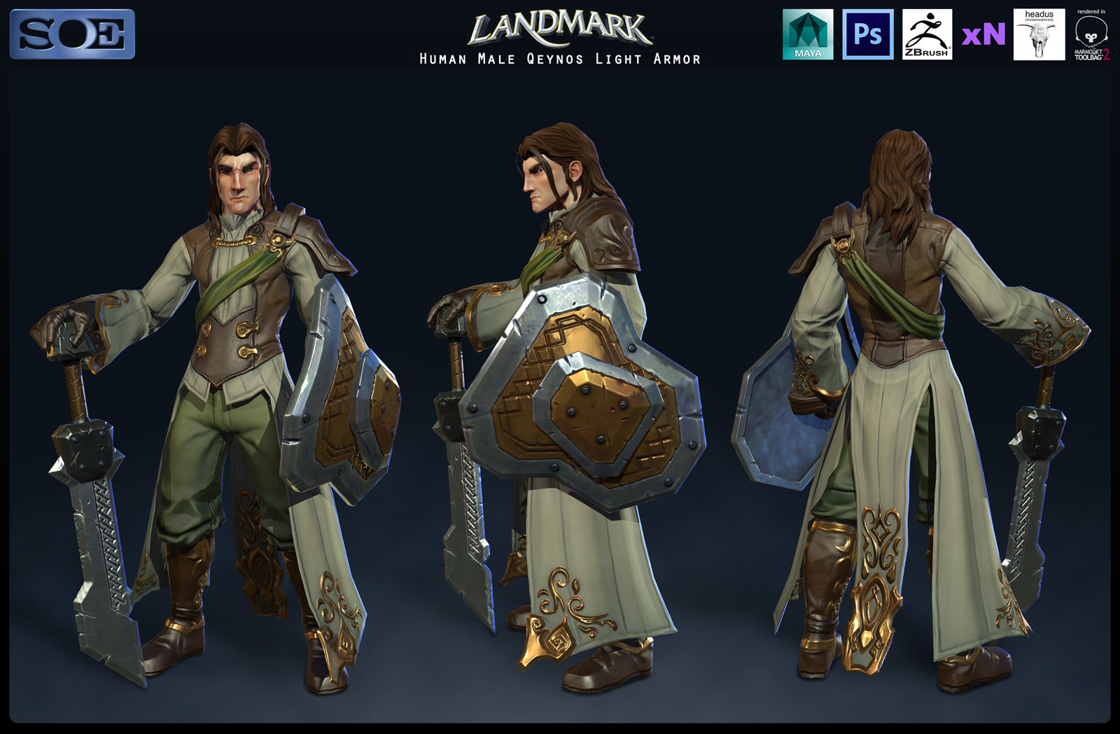 这是一套Qeynos风格的人类男性轻甲,作者是Satoshi Arakawa。在介绍中说,这是他为landmark制作的第一套服装,模型的头部是他自己设计的,而不是游戏实际中会出现的。