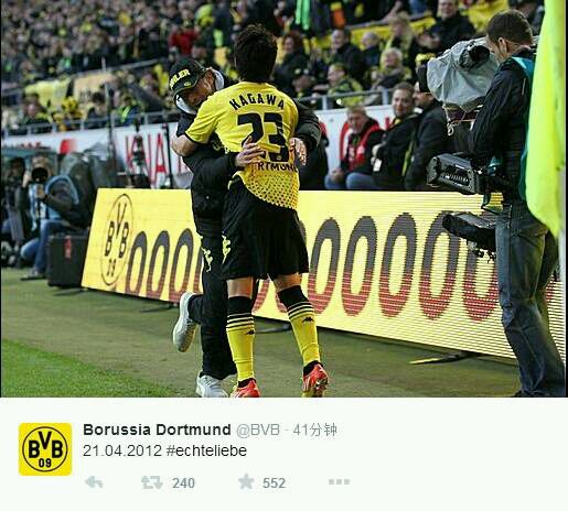 BVB官推昨天发的推特,2012.4.21,三年前的今天。那场比赛多特蒙德2:0击败门兴,在联赛还剩两轮的情况下提前卫冕冠军,香川在比赛中踢入了锁定胜局的第二球,克洛普从场边冲过来把他抱起来。