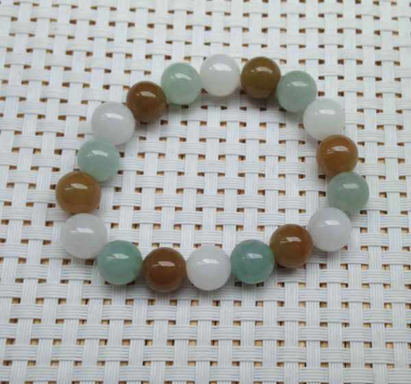 宝贝描述:三彩手链豆绿+黄翡+白色,基本上没有纹裂接近完美,上手效果好,种水细腻,颜色漂亮