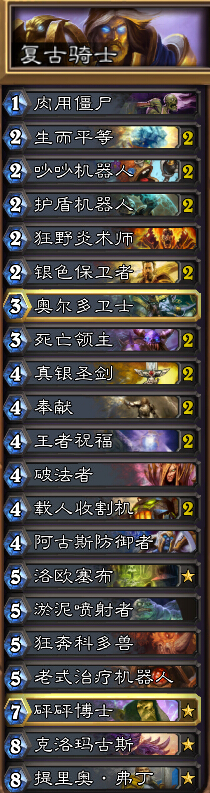 t7 动物园 机械法 最怕3个仆从 肉酱 王阿姨 死亡领主。这2个起手抓到82开。这套骑士是比恩泽牧师还更强大,因为这套牌打后期不虚,而且大保健返场能力超强,打中速咆哮d还很给力(ps:因为是小号,橙不多,建议砰砰换766雪巨人老大,更针对小德,而且现在人手一王牌,脚下踩了无数砰砰尸体)。