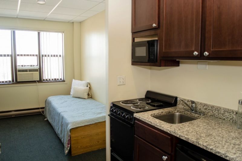 两个单间中间由一个卫生间连通,独立厨房。