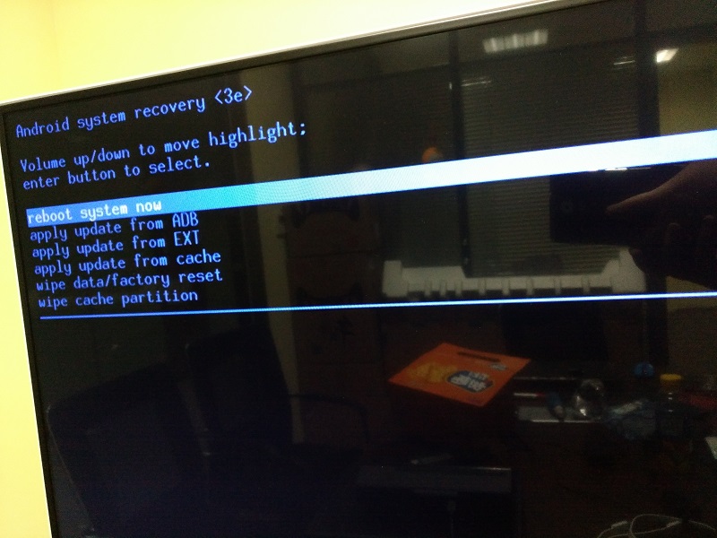 6.看到盒子前部的蓝色电源灯亮起,请迅速取消短接。盒子将进入RECOVERY。选择“apply update from EXT”