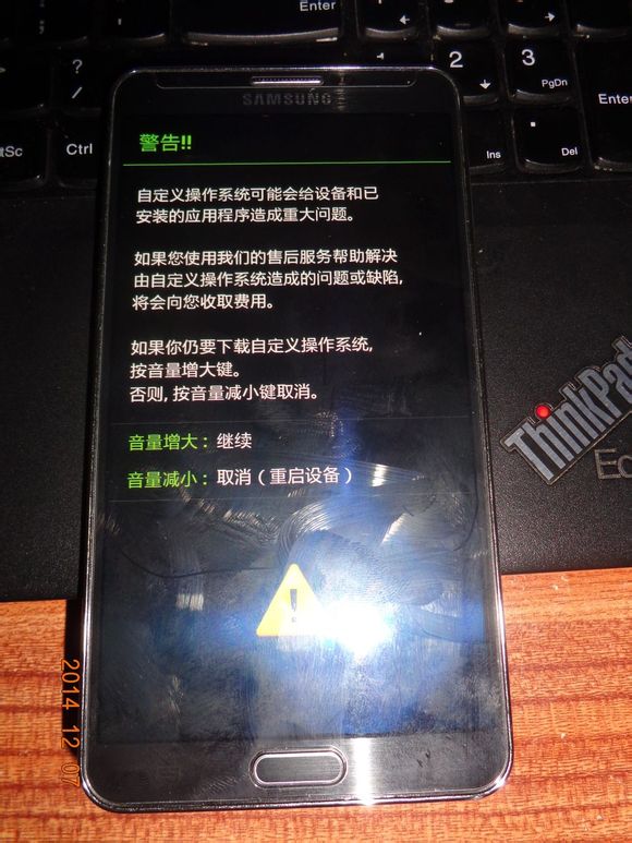 刷进去第三方rom后,开机会看到Samsung画面,左上角有串KERNEL字样的英文,那个不用管,因为是刷进去第三方rom导致的内核与三星不同所导致,没影响的。