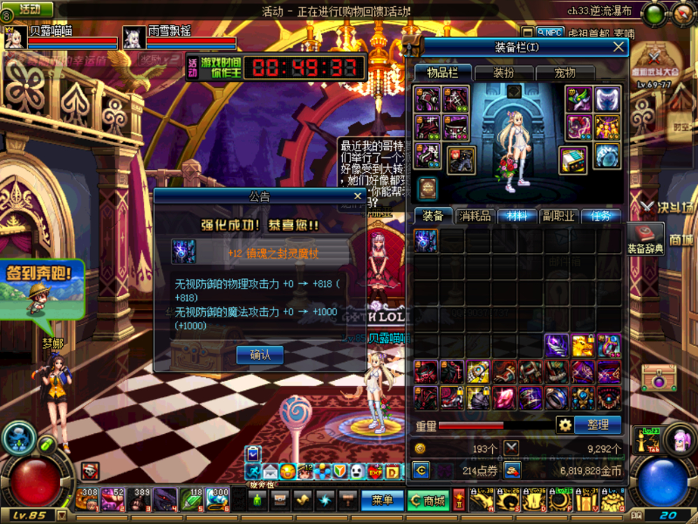 2000票,一个魔战护肩和几个眼睛,无语,旁边一个小女皇,都把我装备爆玩了