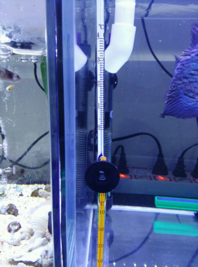 加热棒我设定的28,这两天水温到29了。不过我以前治白点升温到33度持续了半个月也没见鱼受不了~