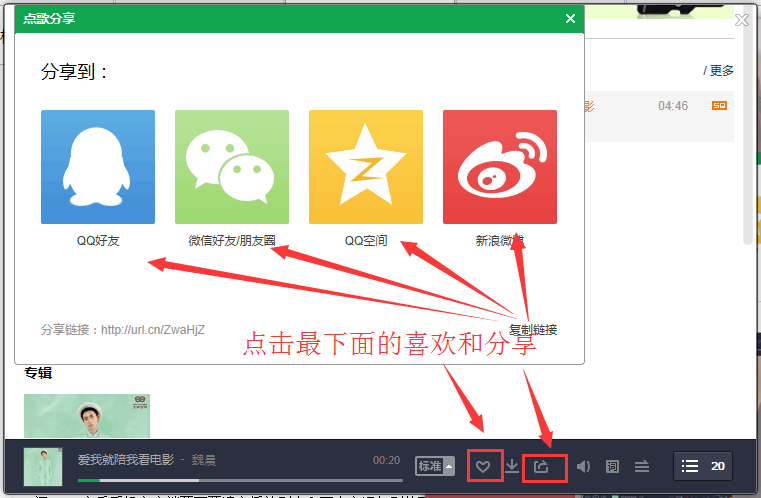 【QQ音乐客户端】大家要登陆QQ音乐,搜索魏晨 爱我就陪我看电影,找到歌曲 然后添加到播放列表20遍,不要单曲循环或者下载,必须完整播放,听完以后清空列表 换个账号重复刚才的操作不要忘了 点击那颗爱心,同时把歌曲分享到其他地方 让更多天听见,
