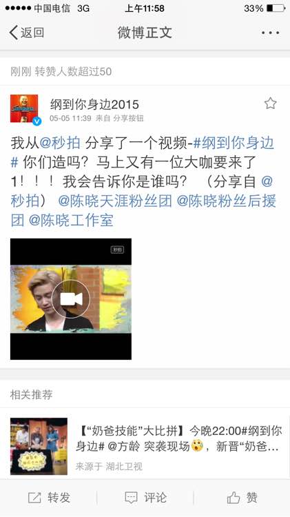 纲到你身边5月11日 周一晚十点!大家记得收看啊!