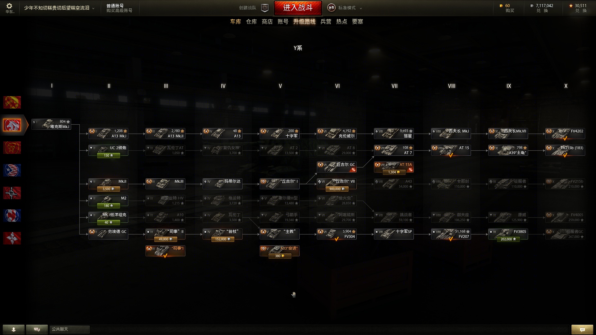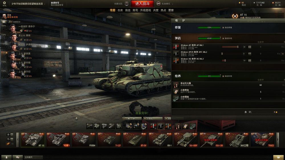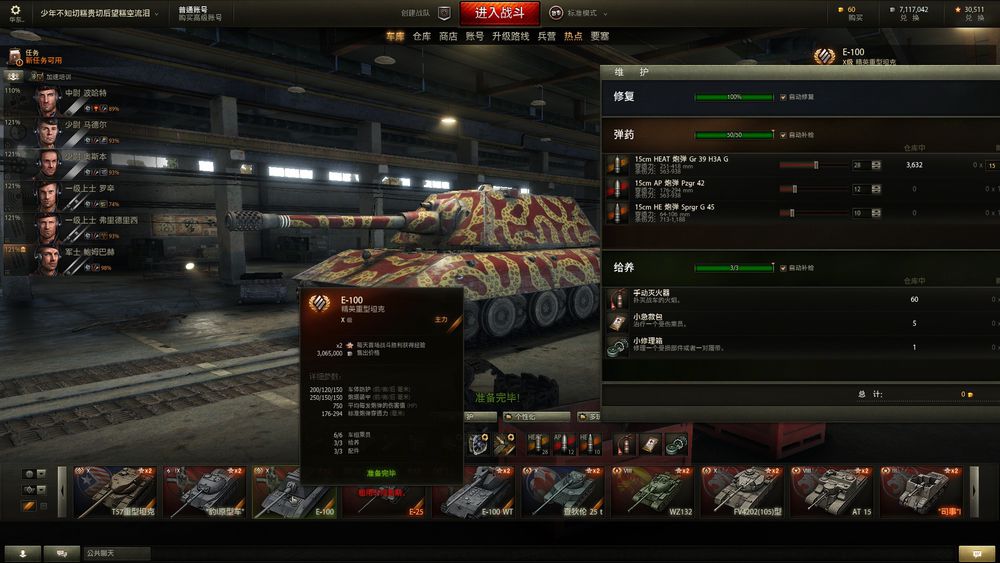仓库有:62.183.-6.t57.e100wt.fv4202(105).巴顿 t110e4.59,fv207 斗牛犬 豹1原型,查涤纶25t,at15.T110E5,WZ111,t54,t49.e100.wz132.263,伪装豹,莱茵,猎虎88等小车若干
