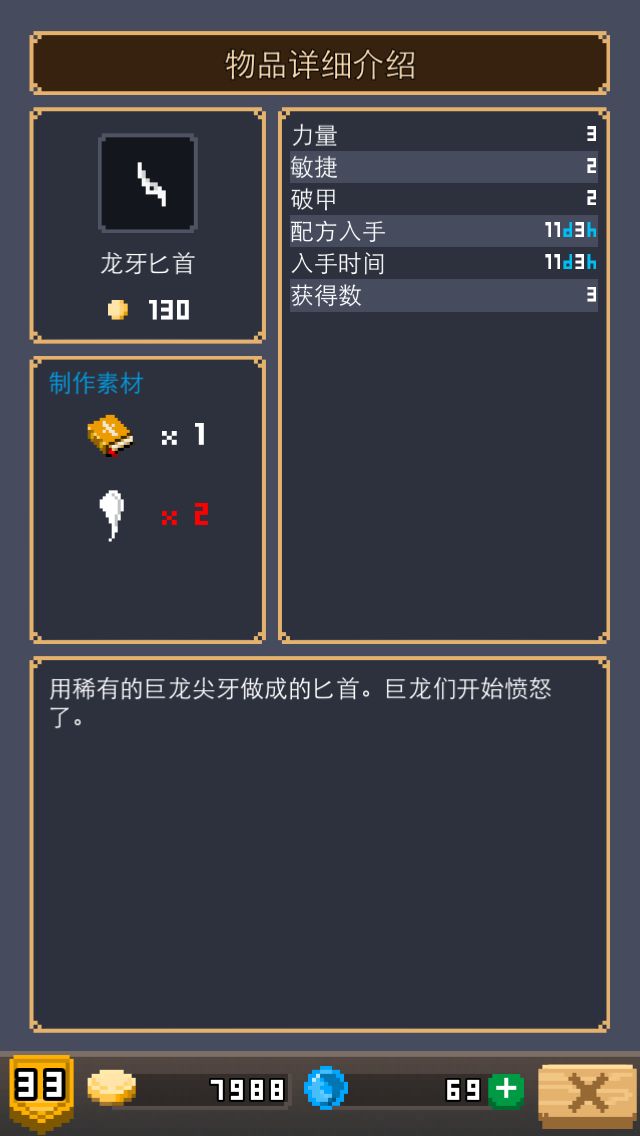 这个匕首应该很少有人有,玩了这么几天,一直只有一颗龙牙,刚刚采集到另外一颗,果断合成,龙牙真是珍贵的东西,还好这匕首属性还看的过去,比金银铜铁强多了。