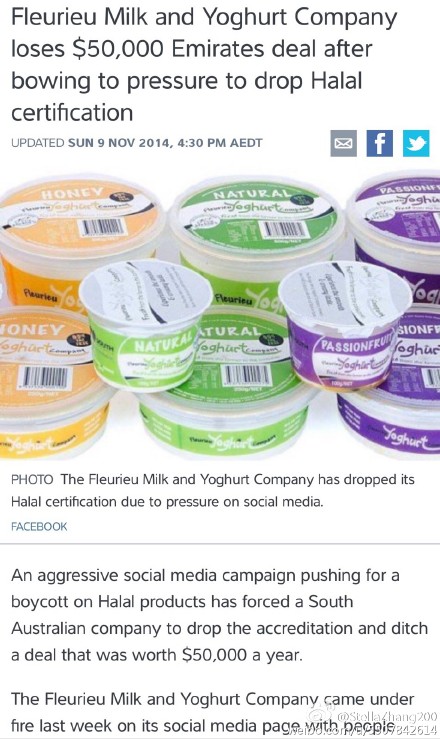澳大利亚南部某乳品厂放弃清真食品认证。该厂八年前因为阿联酋航空的订单开始向伊斯兰协会支付每月$1000的清真食品认证费。由于最近社交网络上的抵制清真食品运动,该厂的fb页不断出现大量负面留言。因担心本地顾客在读到这些负面消息可能产生的想法,经过权衡利弊,该厂决定放弃清真认证并转而向中国出口乳品。