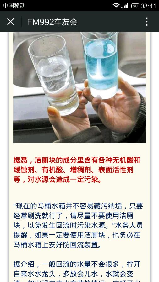 “请不要往自己家马桶的水箱里放蓝色洁厕块。洁厕块只适合有双供水系统的国外楼房,国内几乎没有这样的供水系统。由于主阀门和分阀门没有单向止逆阀,在负压的作用下,污染水会反流进自来水系统,呼吁立即停止这种行为!”