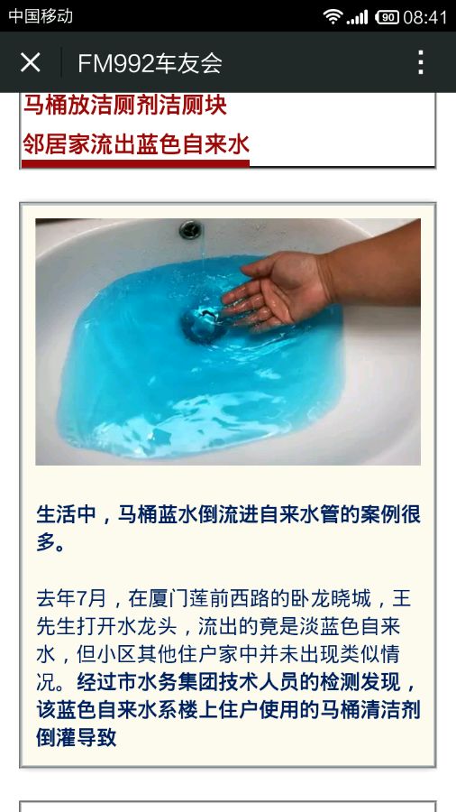 去年7月,在厦门莲前西路的卧龙晓城,王先生打开水龙头,流出的竟是淡蓝色自来水,但小区其他住户家中并未出现类似情况。经过市水务集团技术人员的检测发现,该蓝色自来水系楼上住户使用的马桶清洁剂倒灌导致