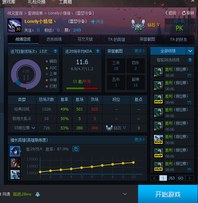 今天打得。这号有毒。双方总有掉线的。输的那场开局中单跟辅助掉线就在没上。。。